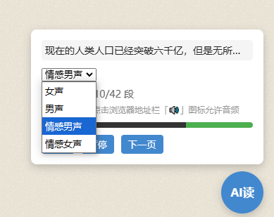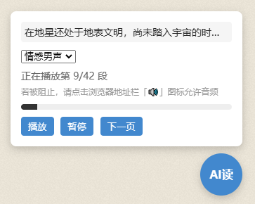 - 播放中点击「下一页」按钮,或当前章节朗读完成后 10 秒无操作,自动跳转到下一章。